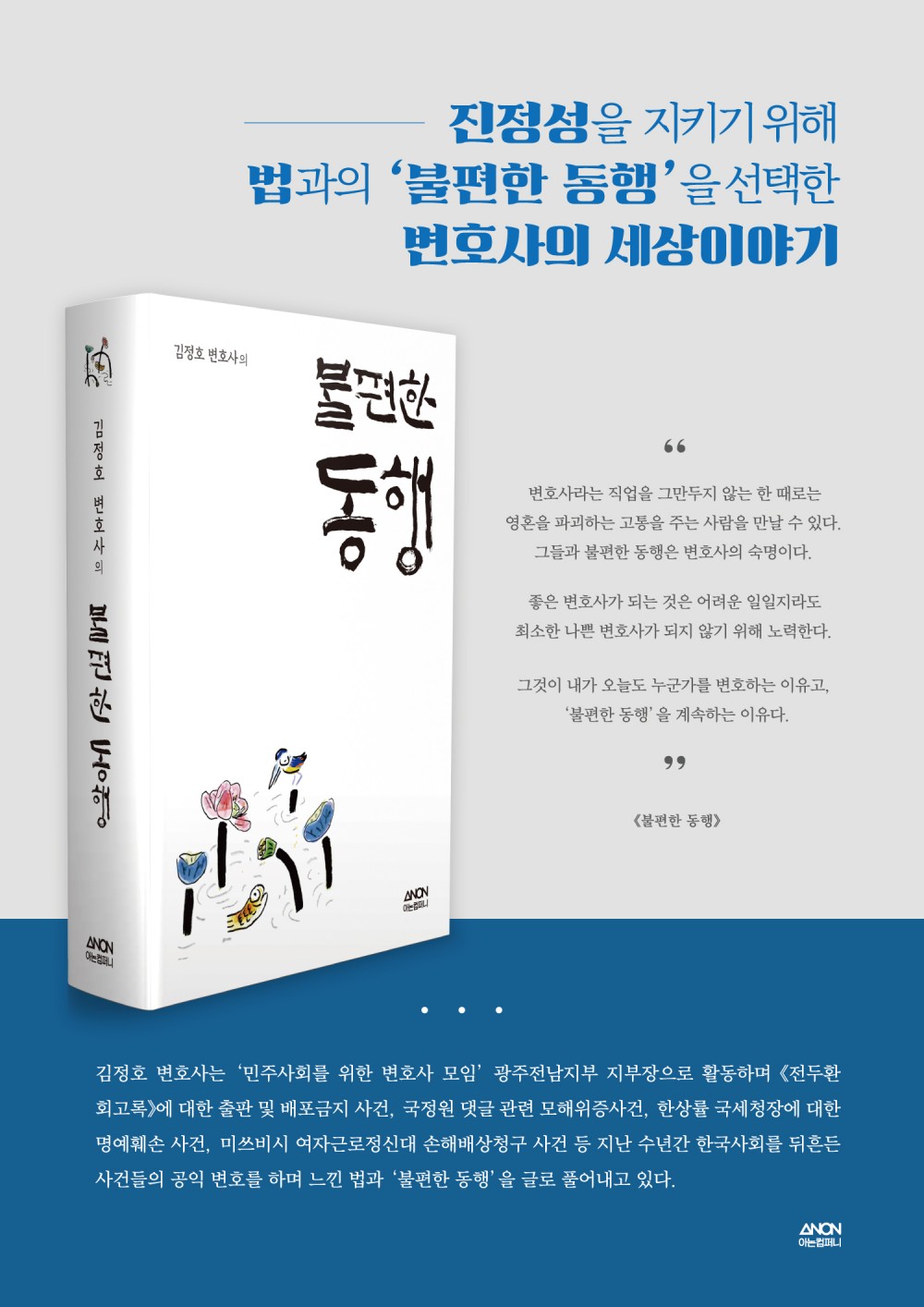 우리의 삶은 기쁘고 즐겁고 행복한 순간을 즐길 때도 있지만 슬프고 괴롭고 힘든 순간을 견뎌야 할 때도 있다. 쉽고 편하게 살면서 우리의 인생이 언제나 아름다운 동행일 수만은 없다. 때로는 진정성과 공감능력을 지키기 위해서 번거롭고 부담스럽더라도 불편함과의 동행을 감수해야 한다. 변호사는 누군가의 대리인이자 변호인으로서 우리 사회의 불합리함과 이웃의 억울함에 맞서서 불편한 동행을 지속해야 할 존재다.글쓴이: 김정호