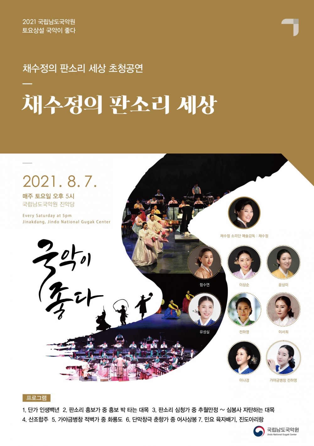 국립남도국악원은 오는 8월 7일(토) 오후 5시에 토요상설 “국악이 좋다”는 진도가 낳은 판소리 명창 채수정을 초청하여 8월 토요상설의 문을 연다.