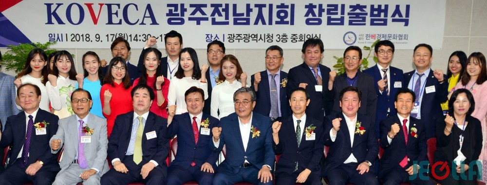 이병훈 광주광역시 문화경제부시장이 17일 오후 시청 3층 중회의실에서 열린 ‘한베경제문화협회 광주전남창립 출범식’에 참석해 내빈들과 함께 기념촬영을 하고 있다.