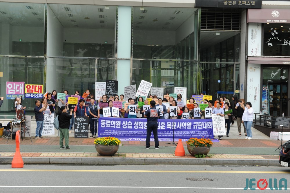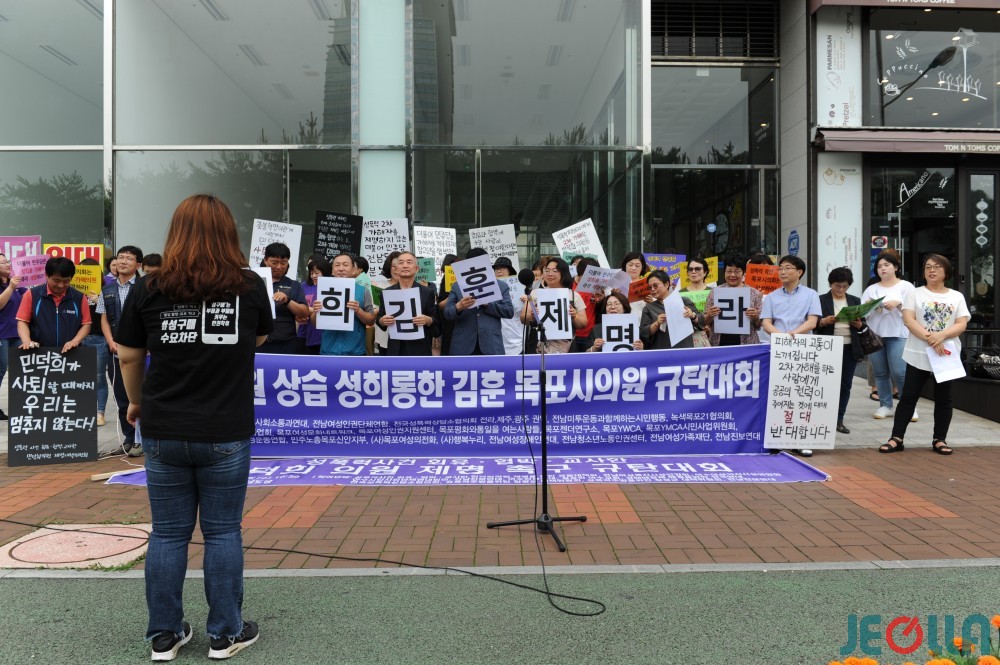 22일, 목포 시민단체가 더불어민주당 전남도당 앞에서 동료의원 성희롱 의혹을 받고 있는 목포시 김 모 의원 규탄대회를 열었다.시민단체는 목포시의회에 해당 의원의 제명을 요구했으며 자신들의 요구가 관철될 때까지 집회를 이어갈 예정이다.