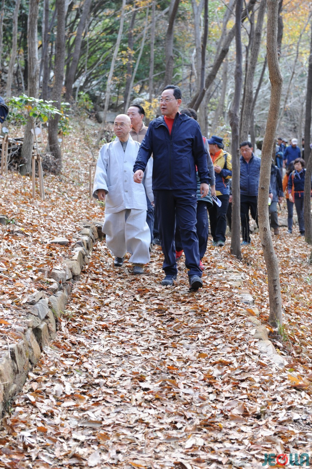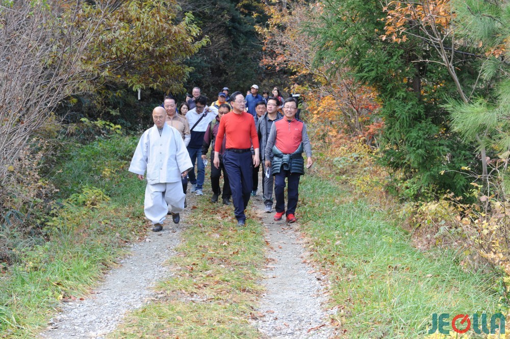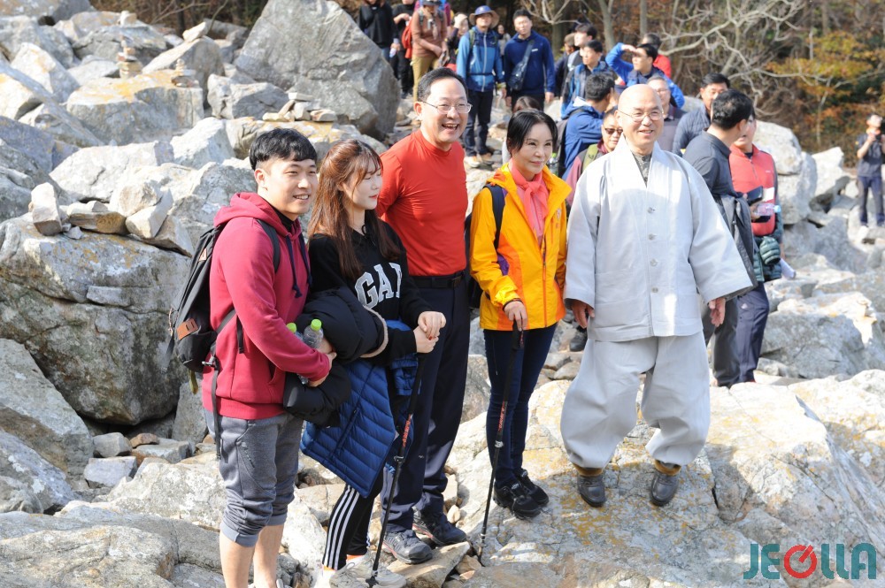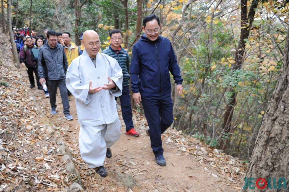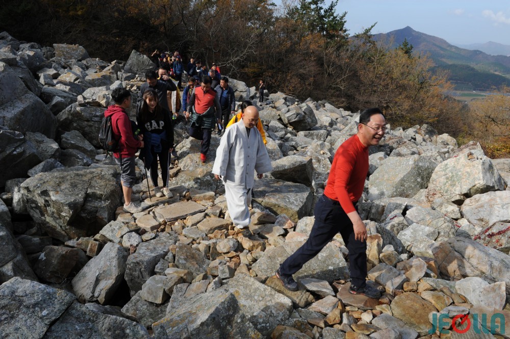 금강스님과 명현관 해남군수님이 달고고도 걷기를 시작합니다. 그런데 아슬아슬하게 건진 컷입니다. 카메라를 보고 해맑게 웃는 참가자 한 분이 두 분의 앞을 가려서...ㅎㅎ