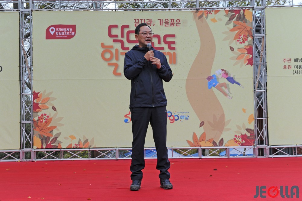 환영사를 하고 있는 명현관 해남군수. 달마고도 조성 경위까지 설명하시느라 연설이 길어지시네요