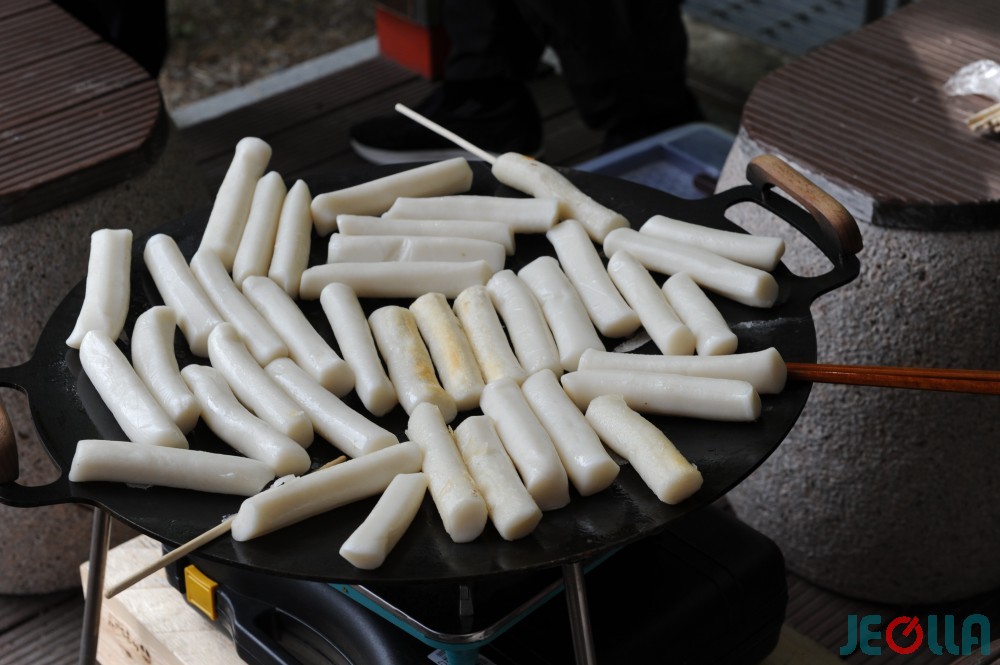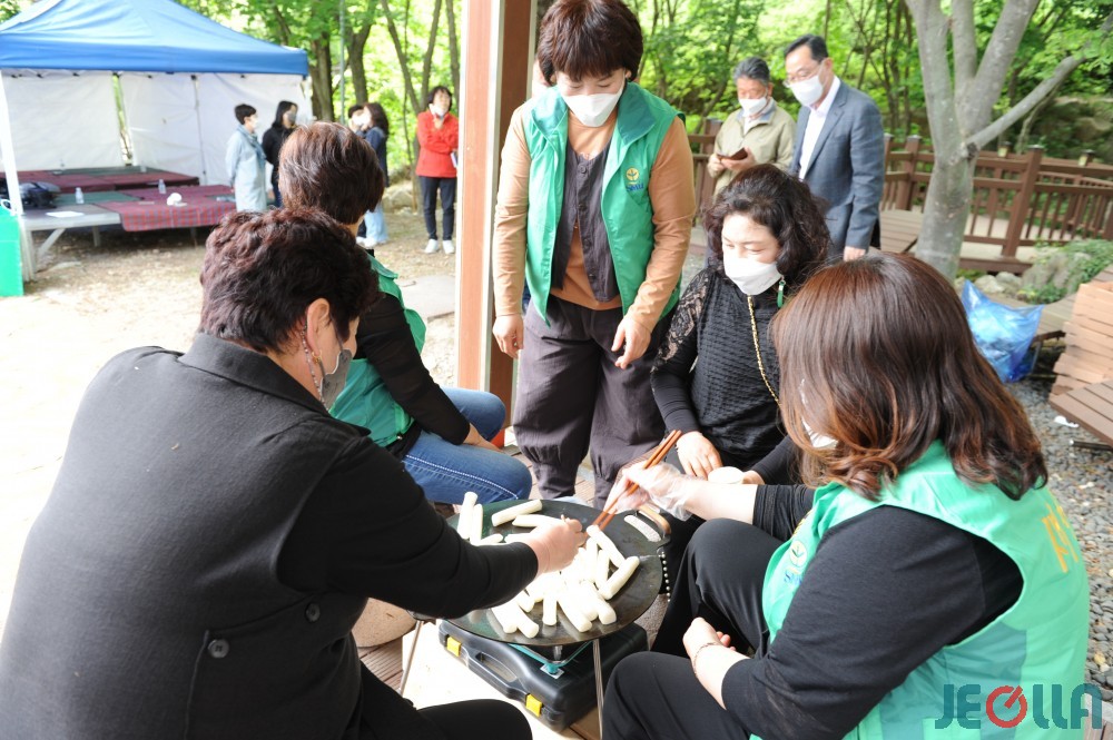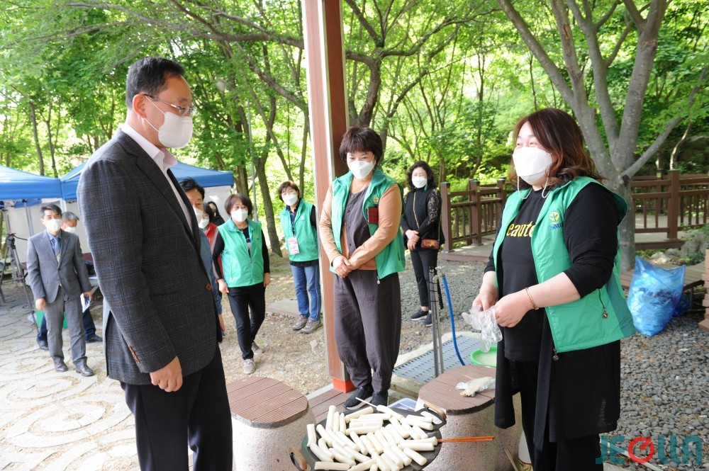 간식거리를 준비하고 있는 행사 관계자들을 격려하고
