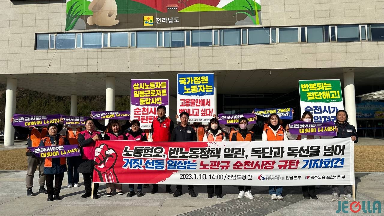 지난 1월 10일, 공공연대노동조합 전남본부와 민주노총 순천시지부는 전남도청 앞에서 노관규 순천시장을 규탄하는 기자회견을 가졌다.