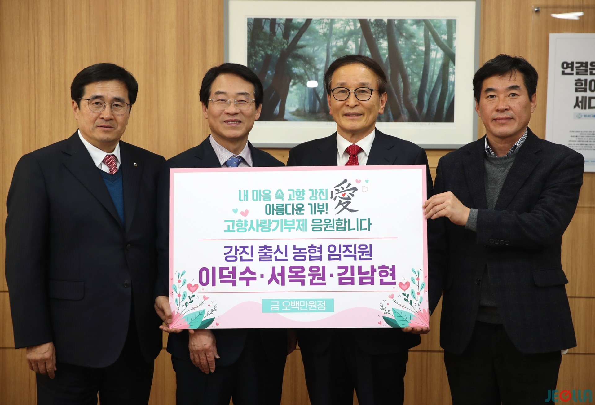 지난 1일, 강진 출신 농협 임직원들이 강진군에 500만 원을 기부했다. 기부자는 농협중앙회 이덕수 사외이사, 농협캐피탈 서옥원 대표이사, 하나로유통 동탄센터 김남현 지사장이다.