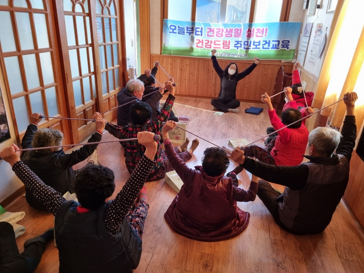 겨울철을 맞이하여 경로당에 모이신 어르신을 대상으로 보건의료원 전문 인력(운동처방사, 영양사, 물리치료사, 금연상담사, 치위생사, 방문간호사 등)이 로프를 활용한 어르신 스트레칭, 노년기 영양·절주· 흡연예방·구강관리 교육, 의치관리법, 틀니세척, 심뇌혈관질환 예방관리 교육 등을 실시하였다.