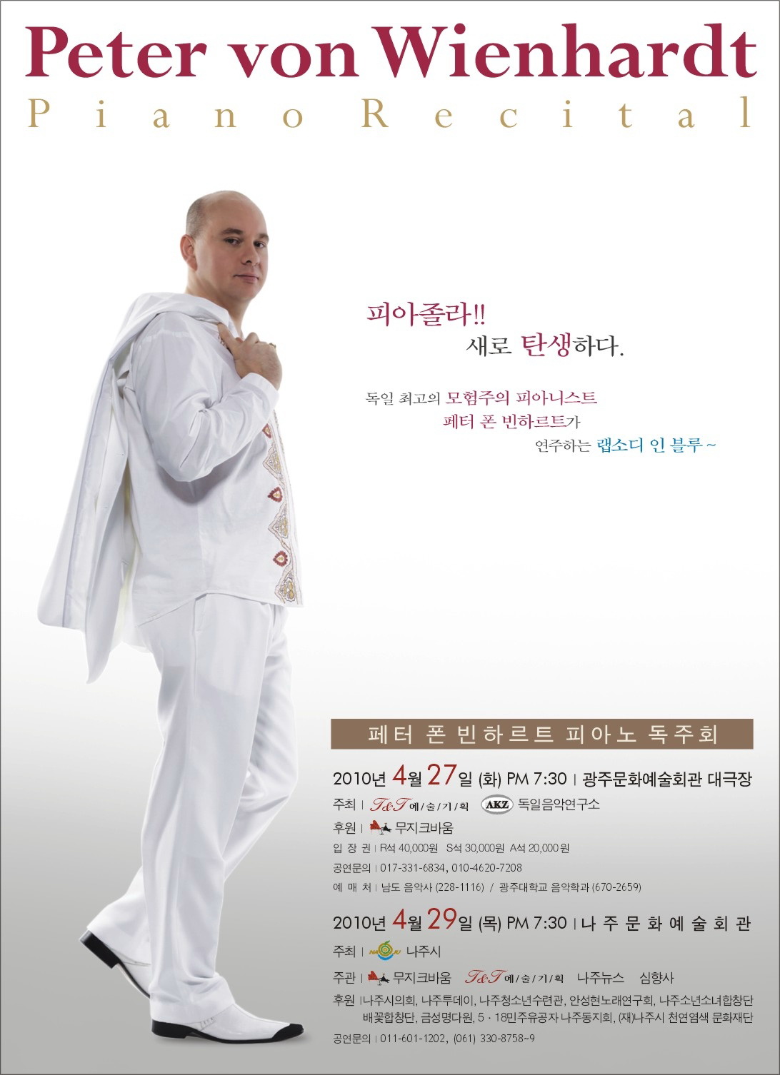 “ 우리 함께 괴짜의 음율에 빠져볼까요 ” 헝가리 출신 천재피아니스트 페터폰 빈하르트 솔로 연주회가 오는 29일 저녁 7시 30분 나주시 나주문화예술회관에서 열린다. 현재 독일 뮌스터 음대 교수로 재직 중인 그는 피아노 연주뿐만 아니라 오페라, 작곡가, 배우 등 다양한 분야에서 활동하는 예술가이다 4월 27일..