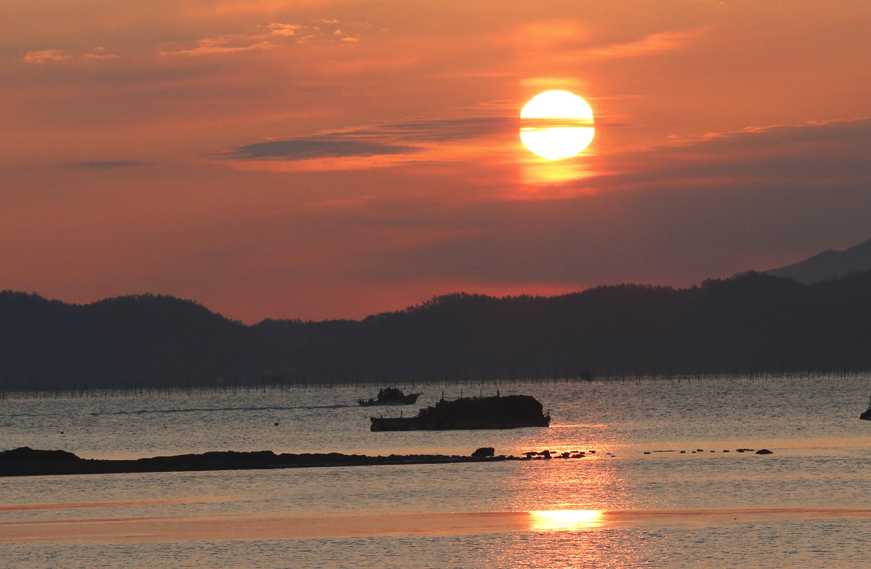 몰아친 한파가 한 풀 꺾인 지난 27일 개불마을로 널리 알려진 전남 강진군 신전면 사초마을의 선착장주변이 붉게 물든 가운데 저물어가는 임진년이 아쉬운 듯 차분하게 아침 해가 떠오르고 있다.